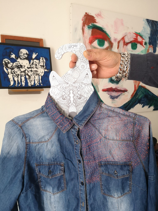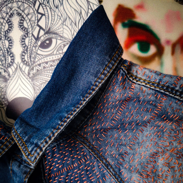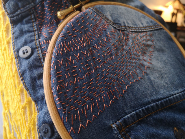 Chemise en jean surcyclée par une broderie à la main (soie cuivrée).