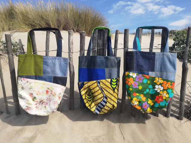 Sac cabas, denim et tissu fleuri d'ameublement (tons bleus ciel, motif végétaux et lapin) upcyclés. Doublé, 4 grandes poches extérieures, 1 poche intérieure, 1 porte clefs.