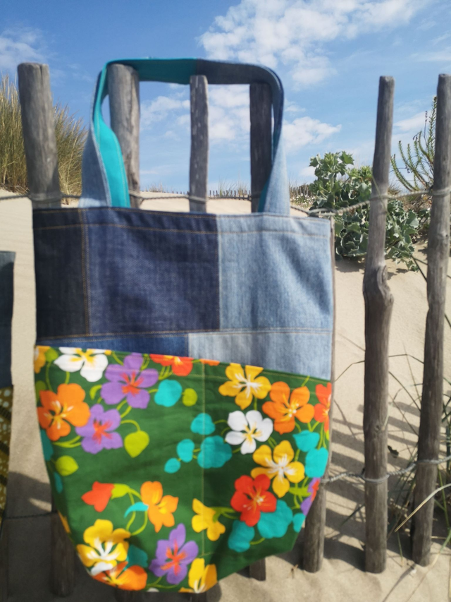 Sac cabas, denim et magnifique tissu d'ameublement upcyclés (face : tons fleuris POP, dos : bleu turquoise).